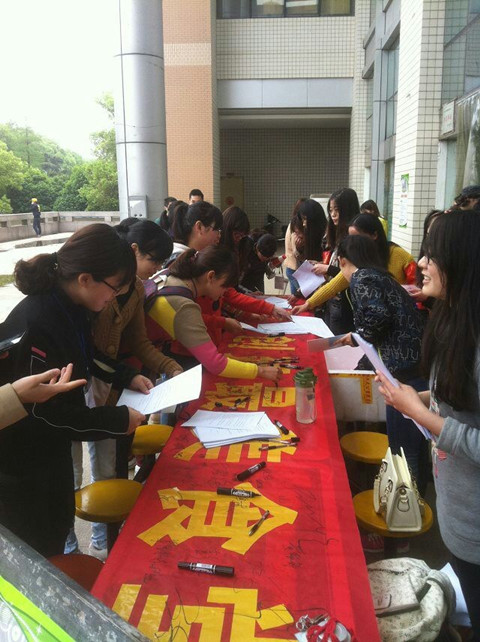 ![]() 本次活动由两部分组成:首先是前期的志愿者招募活动,鼓励大家踊跃报名,截止日期为4月11日;然后是4月13日中午的现场签名会。可见研会工作人员的准备工作做得十分完善。签名会现场,一条醒目的写满字的红色条幅,和不断重复播放的喇叭吸引着来来往往的同学走向前来询问,然后签字。参与活动的同学们均对本次活动表示理解和绝对的支持。一位同学说“就餐环境直接影响到我们的健康,十分重要,希望每个同学就完餐都能直接把餐具送到回收处,保持食堂卫生。”另一位同学说“主动送餐具本来就是就餐同学的义务,却偏偏要劳烦清洁阿姨来回收,实在不像是大学生的作为。”
