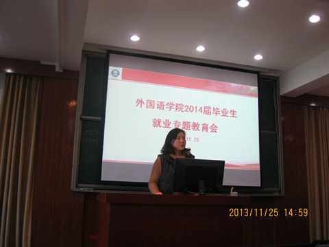 2013年11月25日下午2:30,2014届毕业生就业专题教育会在外国语学院3408教室顺利召开。党委副书记张静及研究生辅导员郭聿晨出席本次会议,对新一届的毕业生提出了各种宝贵意见和建议。本次会议对毕业生的就业具有重要的指导意义。