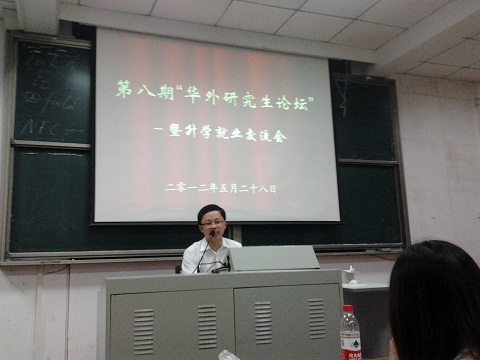 2012年5月28日晚,外国语学院学术部在3101教室举办了“华外研究生论坛”第八期活动,暨毕业年级升学就业交流会。