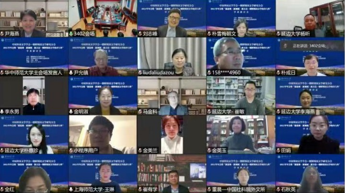 2021年11月5月-7日,由中国外国文学学会朝鲜-韩国文学研究分会主办,华中师范大学外国语学院韩国文化研究所承办的“中国外国文学学会朝鲜-韩国文学研究分会2021年年会暨‘新思维·新视域·新方法——朝鲜-韩国文学的内与外’”学术研讨会在我院成功举办。由于近期疫情严重,此次会议采用线上线下相结合的方式进行。来自山东大学、中国社会科学院、中央民族大学、吉林大学、南京大学、延边大学、北京外国语大学、广西师范大学、南昌大学、西安外国语大学、北京第二外国语学院、潍坊学院、南通大学杏林学院、中国海洋大学、深圳职业技术学院等40多所高校和研究机构的100多位专家和学者相聚“云端”,共享朝鲜-韩国文学研究的学术盛宴。