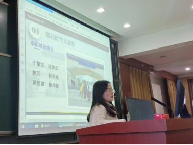 杭州学军中学实习小组的于馨悦同学用三个富有诗意的标题:“落花时节又逢军”、“今日听军歌一曲”、“请军为我倾耳听”,向大家娓娓道来学军中学忙碌而充实的实习生活。她展示了学军中学丰厚的实习成果以及深刻的所思所想,其中包含了对华中师范大学外国语学院优秀院友,同时也是杭州学军中学实习指导老师的黄刚老师的采访。她讲述到:“作为新一代的华师外院人,我们会以华师精神为引领,以优秀院友为榜样,用世界语言讲好中国故事,将青春之花绽放在祖国的教育热土之上。”