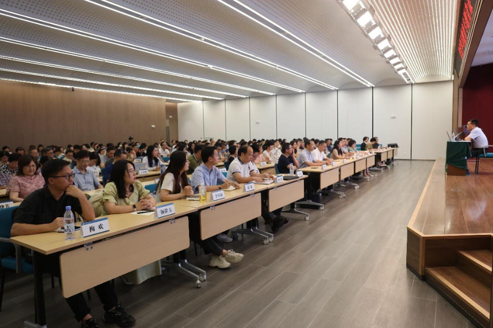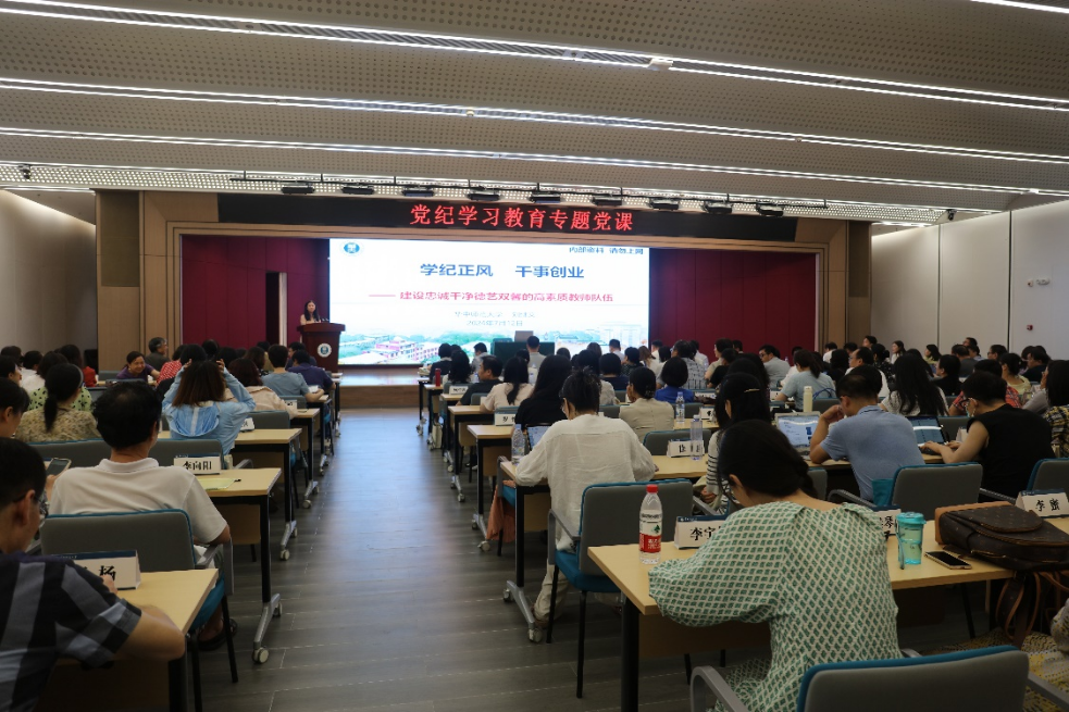 为推动党纪学习教育走深走实,引导全院教职工学纪、知纪、明纪、守纪,7月12日下午,校党委副书记、纪委书记刘继文以“学纪正风 干事创业——建设忠诚干净德艺双馨的高素质教师队伍”为主题,在文科综合楼101报告厅为外国语学院全体教职工讲授专题党课,学院领导班子成员及全体教职工参加此次学习。专题党课由学院党委书记麻旎主持。
