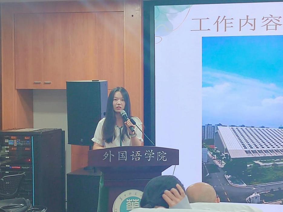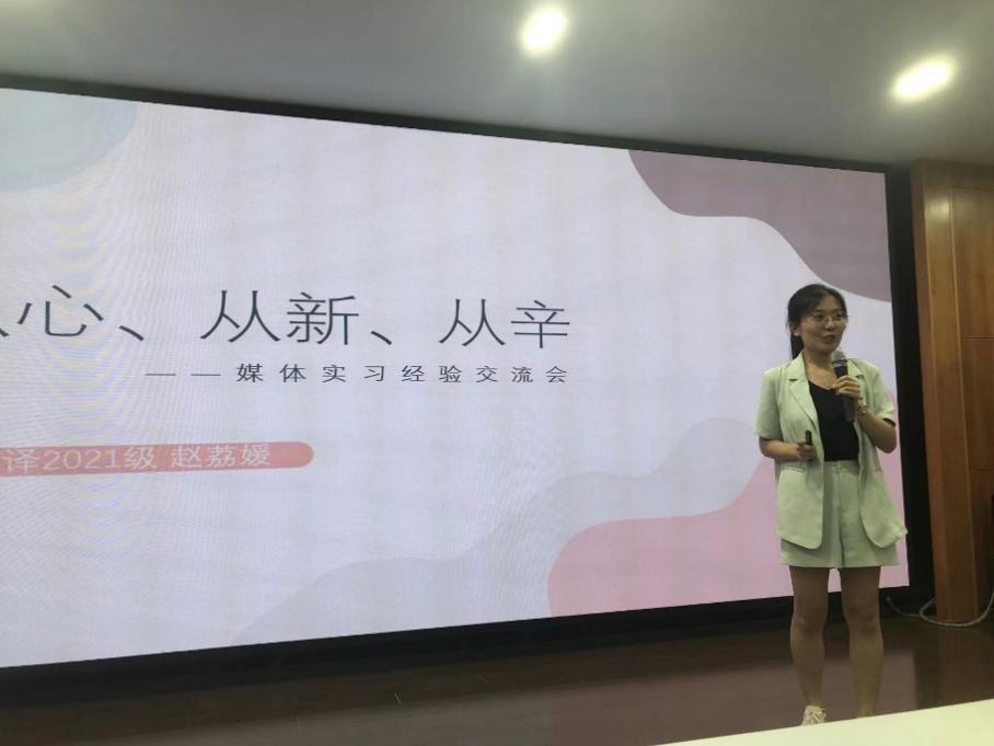 2021级翻译专业本科生綦小芳带来了重庆西部国际传播中心的实习心得,她强调了搜索筛选能力的重要性,并分享了如何利用英语技能拓展其他领域知识。