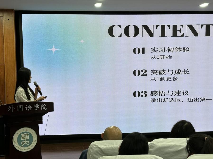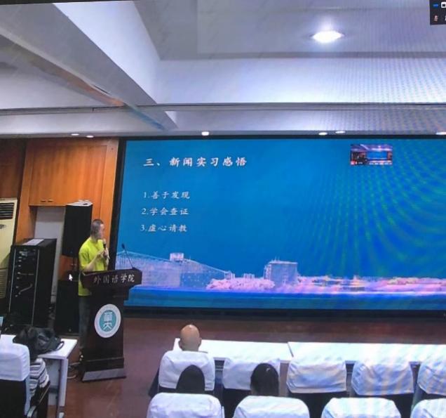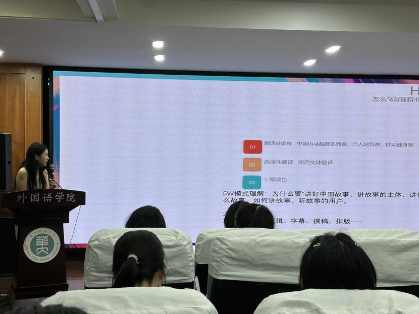 最后,2023级翻译硕士生李佳从实习经历中提炼出思维转型的精髓。她分享了视频素材选取的美学追求、拍摄质量的精益求精以及立场正确的坚守之道,鼓励同学们在实践中不断挑战自我,勇于尝试新事物,不要畏难设限。