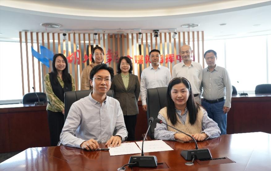 湖北日报新媒体中心主任张磊与外国语学院党委书记麻旎代表双方签署合作协议