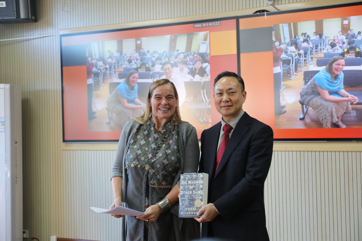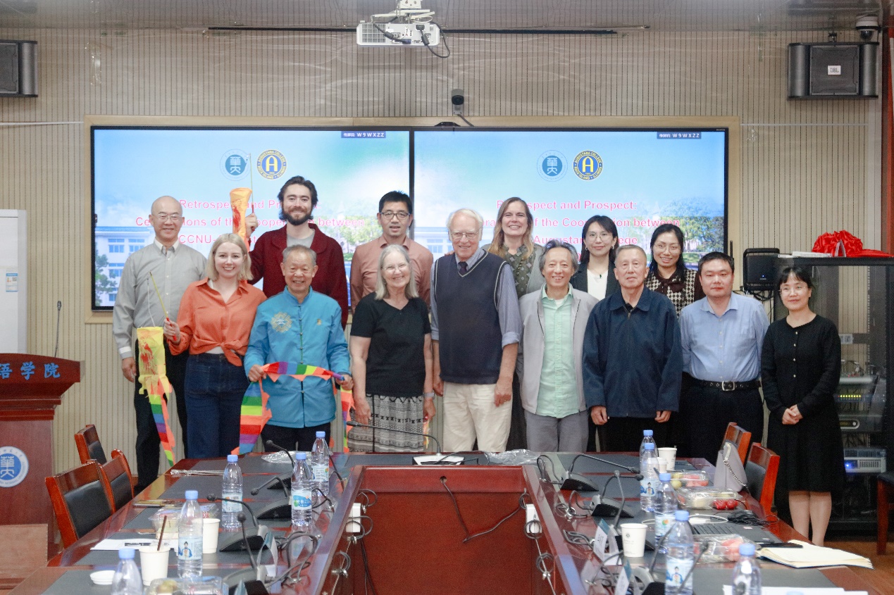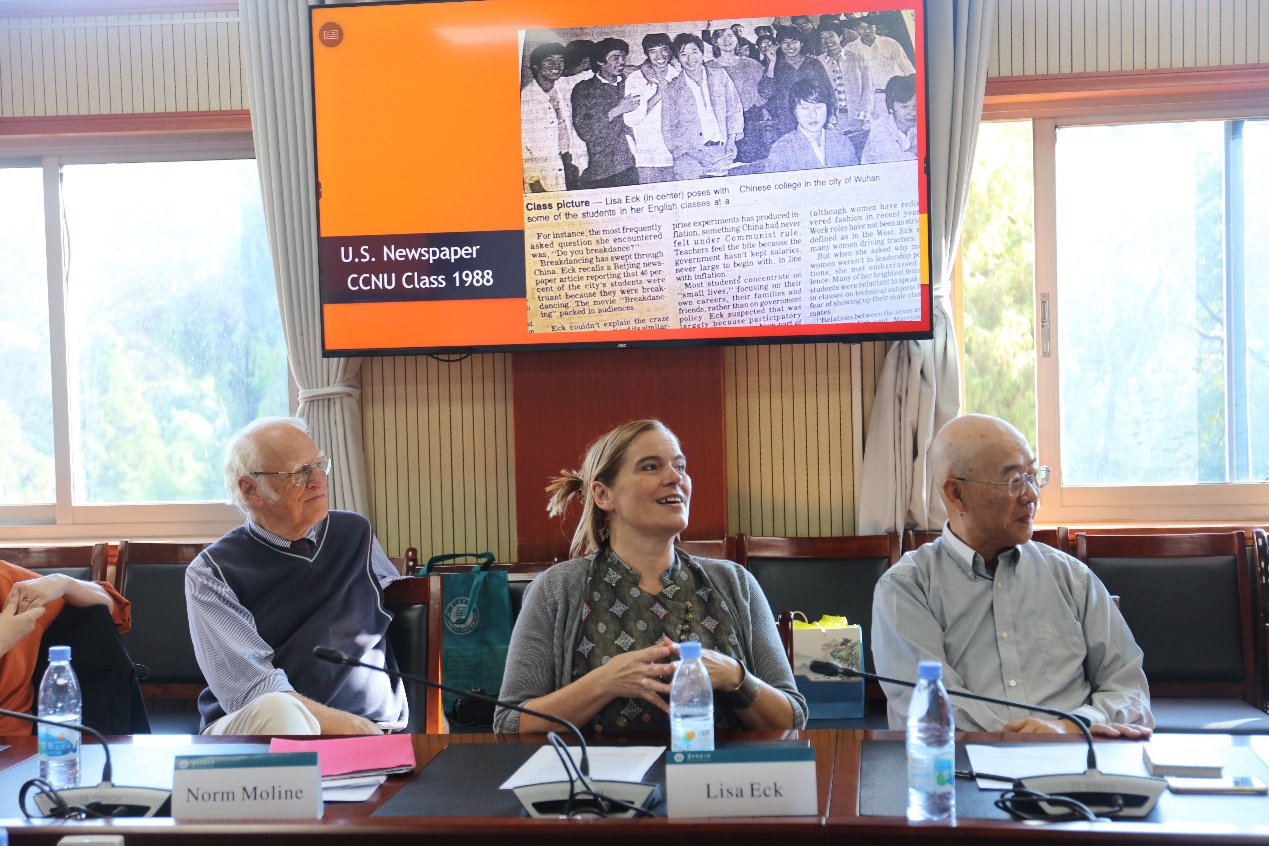 下午14:30-17:30,“华中师大—奥古斯坦纳学院合作交流36周年回顾与展望”联谊会在外国语学院3402会议室举行。外国语学院和国际处负责人、Moline教授以及1988年以来参与该项目的中美教师代表约20人参加。联谊会分为两段,上半段由国际合作项目主管王盛夏主持。罗良功院长致辞,高度赞扬这一历史悠久的交流项目,特别向Moline教授以及36年来为这一项目做出贡献的双方教师致敬。Moline教授作为该项目的创立者和见证者,美国弗莱明翰州立大学英语系主任、1988年奥古斯坦纳学院首批派驻我院任教的Elizabeth Eck教授,我院英语系向宗平、公共外语系主任杨畅老师分别发言。在下半段,曾经参加或正在参加这个项目的中美教师自由交流,老师们深情回顾了各自在中国或美国参加该项目的教学生活经历,并期待在新的时代进一步加强合作、增进友谊、共同发展。