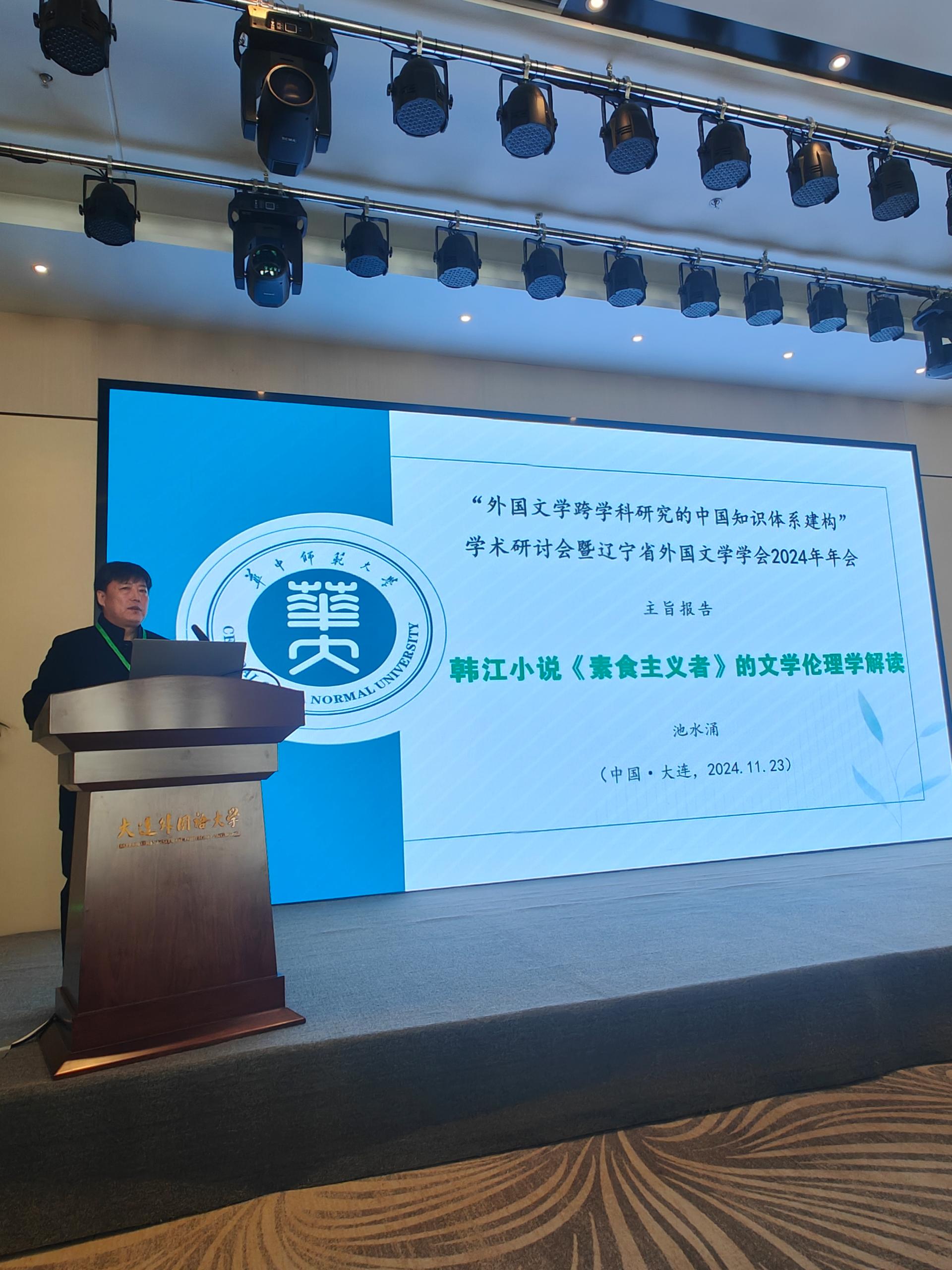 2024年11月23日,辽宁省外国文学学会在大连外国语大学举办2024年年会,年会主题为“外国文学跨学科研究的中国知识体系建构”。来自东北大学、大连理工大学、辽宁师范大学、大连外国语大学等高校的一百二十多位专家、学者参加了本次年会。我院池水涌教授应邀参加本次年会,以“韩江小说《素食主义者》的文学伦理学解读”为主题做了大会报告。