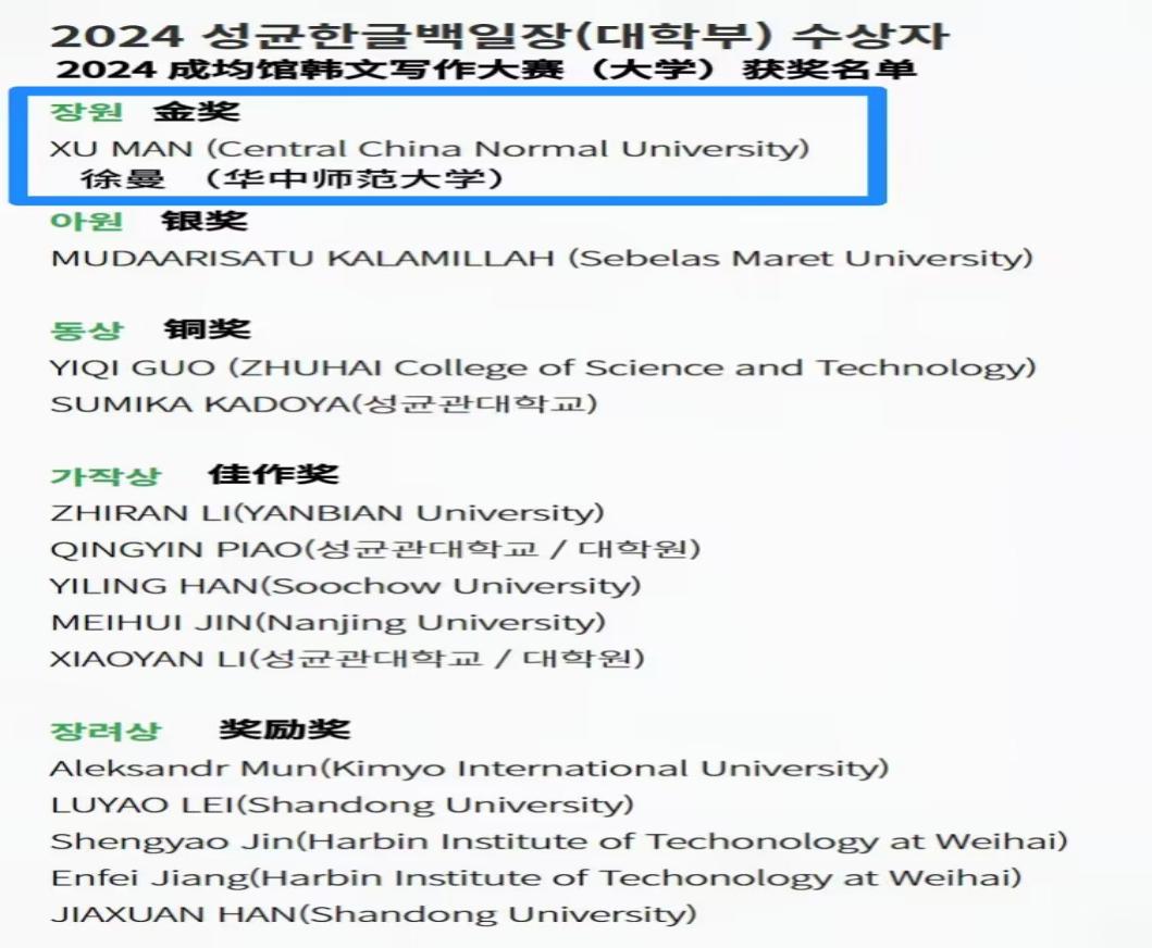 近日“2024成均韩文写作大赛(大学)”获奖名单揭晓,我院朝鲜(韩)语专业2022级徐曼同学荣获“장원”(金奖)(总排名第1,本科生排名第1),是我系学生近年来在此次大赛中获得的历史最好成绩。