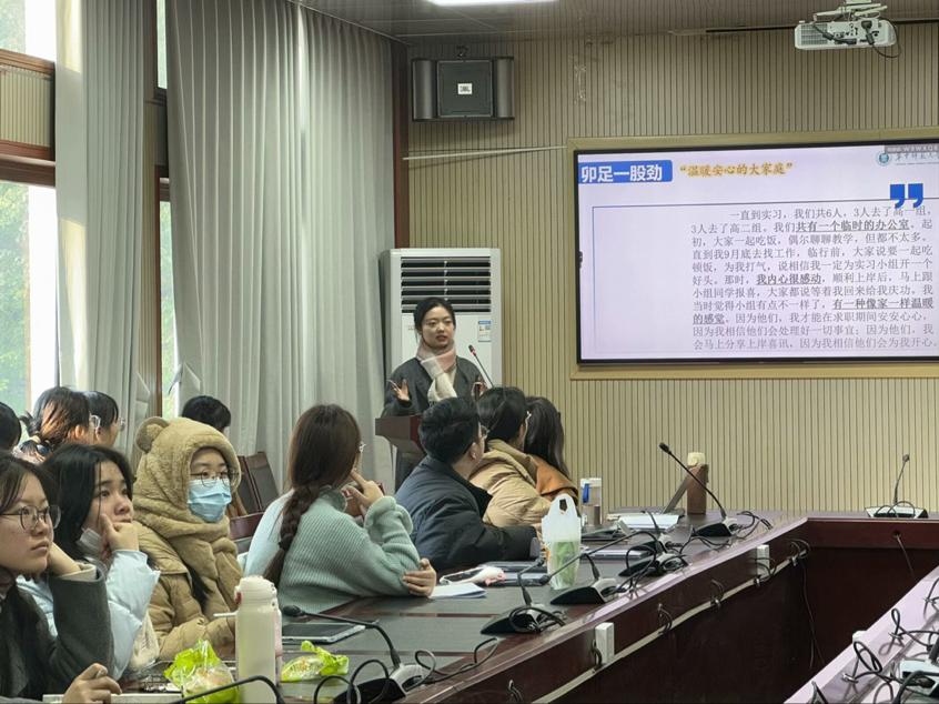 接着,祝悦同学以自己所在武汉二中实习小组为例,讲述了专业学习共同体理念的引领下实习小组通过合作和互动逐渐实现共赢成长的故事。她讲述了实习小组在集体通勤、教学资源共享、共同备课及授课、小组实习反思等环节中彼此合作的具体细节,指出小组合作不仅帮助实习生个体实现了专业能力的提升,还促进彼此收获了珍贵的友谊和团队精神。她们的故事充分展现了合作学习在教育实践中的巨大价值,能够为其他硕士生提供了积极的范例,激励同学们在未来的实践环节中加强同伴友谊关系,积极构建以教育实践为基础的专业学习共同体,全面提升教师教育实习实践的育人效果。