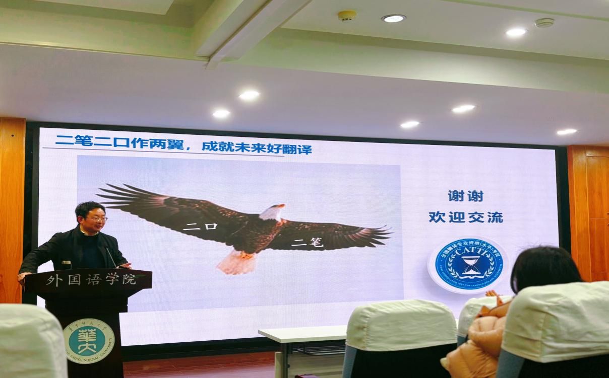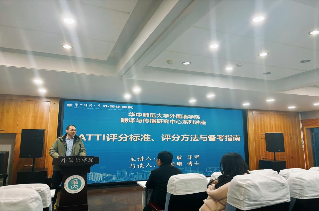 2024年12月26日下午,由外国语学院主办的“CATTI评分标准、评分方法与备考指导”讲座在3504报告厅顺利举行。此次讲座特邀了全国翻译专业资格(水平)考试英语专家委员会委员、湖北省翻译工作者协会副会长兼秘书长、武汉大学黄敏译审/副教授主讲。黄敏老师拥有多年CATTI考试阅卷、官方指定教材编写及模拟考试训练平台命题经验,是国内翻译证书考试研究的知名专家。其辅导讲座内容丰富、幽默风趣、干货满满,吸引了众多师生参与。本场讲座由MTI教育中心覃江华教授主持。
