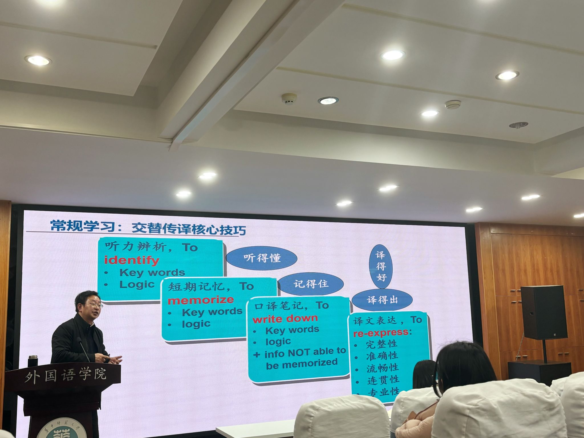 黄敏老师接着对二级口译备考方法做了详细的讲解。他指出,二级口译主要包括两个部分:综合能力和实务能力。在综合能力部分,考生不仅要具备良好的听力能力,更要能够快速捕捉并总结核心信息,准确传达给听众。黄敏老师特别强调,口译考试中最重要的是信息完整性,而不仅仅是语言的准确性。口译员在传递信息时,应注重信息的连贯性和流畅度,尽量避免过。