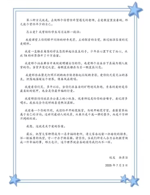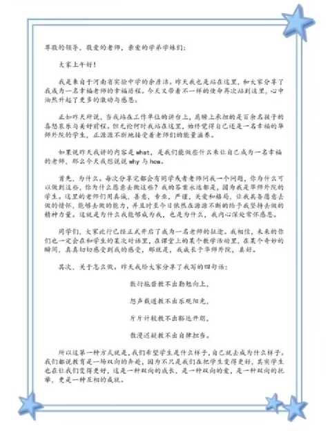 随后,华师校友、来自河南省实验中学的实习指导教师代表余彦洁向学弟学妹们送上殷切寄语。余老师围绕“如何做一个学生喜欢的幸福老师”展开分享,传递了深刻的教育理念,“想教出什么样的学生,就要先成为什么样的自己,师生之间是双向的成长托举。希望同学们在未来的教育实践中,努力成为年少时自己最想遇到的老师,做一个有血有肉、充满教育情怀的教育工作者”。真挚的话语饱含着对外院学子的期待与关怀。