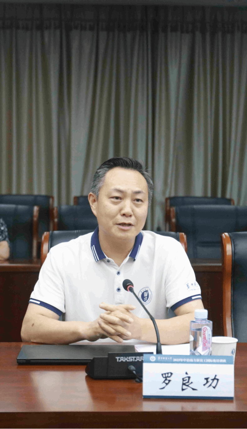 外国语学院院长罗良功教授介绍了本次培训的方案和安排。他从培训目标、培训内容、培训形式、培训师资、培训质控等五个方面对本次培训的设计逻辑、创新特色与具体安排作了简要阐述。