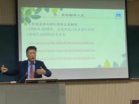 讲座开始,王教授先回顾了他丰富的翻译实践和翻译研究人生旅程,涉及新闻翻译、公示语翻译、传教士汉学翻译与中西文化交流史、中医翻译史、南京大屠杀史料翻译等。然后,他切入讲座主题,以国家主席习近平今年3月访问法国期间,法国总统马克龙赠与他1688年巴黎出版的法文版《论语导读》为引子,以翔实史料介绍了明末清初来华耶稣会士通过翻译活动开拓的长达两个世纪的“西学东渐”和“中学西传”中西文化交流活动,包括关键人物、阶段分期、“西学东渐”主要成果,“中学西传”主要成果对欧洲的影响等等。在讲座中,他重点介绍了他今年10月应邀前往牛津大学人类学院开设的专题讲座内容,详细考证了明末来华波兰传教士卜弥格通过书信或译介重要中医著作向欧洲介绍传播中医及其译作在欧洲出版的曲折经过,对这段在中西文化交流史上曾经被学界忽视事件做了详尽的解读,证明了卜弥格是第一个将中国古代的科学和文化成果系统地介绍给西方的欧洲人,但由于种种原因他的作用一直没能得到全面的认识和评价。2016年,国家主席习近平在对波兰共和国进行国事访问前夕在波兰媒体发表署名文章,称卜弥格为“波兰的马可波罗”。