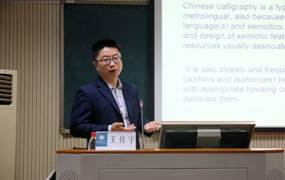第七场报告是“Chronotopic Identities in Chinese Poetry Calligraphy as Metrolingual Text Art”。华中师范大学外国语学院王佳宇教授从社会语言学的视角,分析了不同书法爱好者的书法作品《相见欢》,这些书法作品被视作城市语言学语篇。诗歌作者基于特定的主题进行创作,从而构建一种身份;书法创作者根据自己对诗歌的理解,在创作书法作品时抒发自身的情感,也构建了一种身份。王佳宇教授探讨了这些跨越不同时空的身份如何在书法作品中共存、融合及竞争。