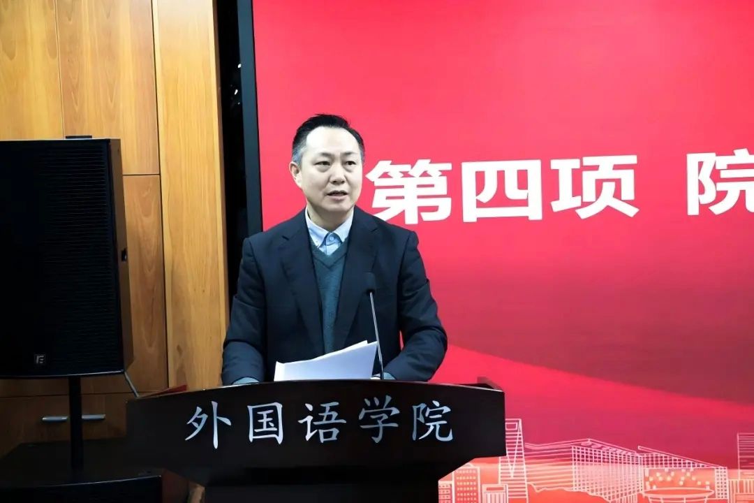 罗良功代表学院作工作报告,围绕2025年学院工作、“十五五”发展规划及2026年重点任务三大板块展开,提请代表审议。报告指出,2025年作为“十四五”收官之年,学院以习近平新时代中国特色社会主义思想为指导,紧扣立德树人根本任务,在党建、教育教学改革、人才培养、学生就业、学科科研、国际国内合作、文化建设等多领域斩获丰硕成果。报告同时客观剖析了学院发展的短板。立足长远,报告明确“十五五”发展总目标:到2035年建成“外语教师教育领先、人文优势突出、学科交叉特色明显”的世界一流外语学科,期间将聚焦打造国家级文科实验室等六大核心任务,在党建、学科发展、师资、育人等七大维度设定具体目标。针对“十五五”开局关键年,报告部署2026年重点工作,为世界一流外语学科建设筑牢开局根基。