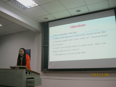 电影开始前,学术部部长白星同学就影片给予简短描述并有针对性的提出一些问题引导大家思考,然后进入电影欣赏环节。该电影改编自美国作家弗·司各特·菲茨杰拉德同名小说《了不起的盖茨比》。小说以20世纪20年代的纽约市及长岛为背景,围绕美国社会中上阶层的白人圈而展开。《了不起的盖茨比》奠定了菲茨杰拉德在现代美国文学史上的地位,成了20年代“爵士时代”的发言人和“迷惘的一代”的代表作家之一。20世纪末,美国学术界权威在百年英语文学长河中选出一百部最优秀的小说,《了不起的盖茨比》高居第二位,傲然跻身当代经典行列。