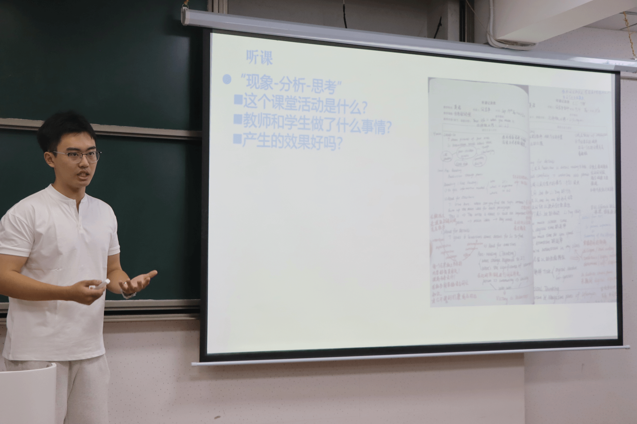 2021级英语专业本科生邱鸿兴首先进行经验分享。他的分享主要围绕教育实习和就业两个板块展开。在教育实习方面,他建议同学们提前熟悉教材,提升自我的教学能力。在就业方面,他从笔试和面试两个环节分享了自己的经验,为同学们提供了清晰的准备方向。