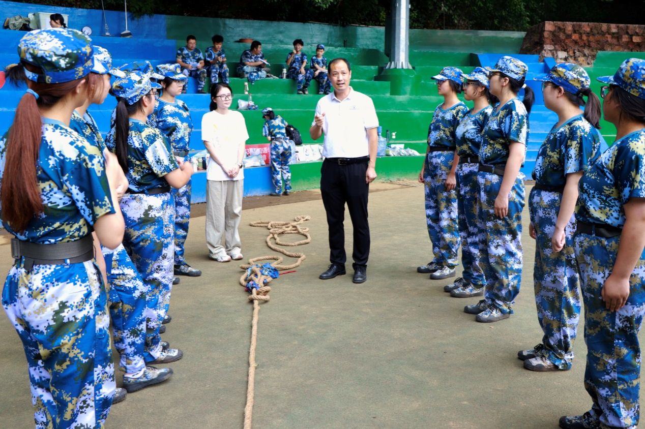 赛前,军训教官亲身示范拔河技巧要领,外国语学院党委副书记罗舰、辅导员张志彬和张紫韵到场鼓励同学们注重团队协作、发扬集体精神。外院队员认真准备,以良好状态迎接每一场比赛。
