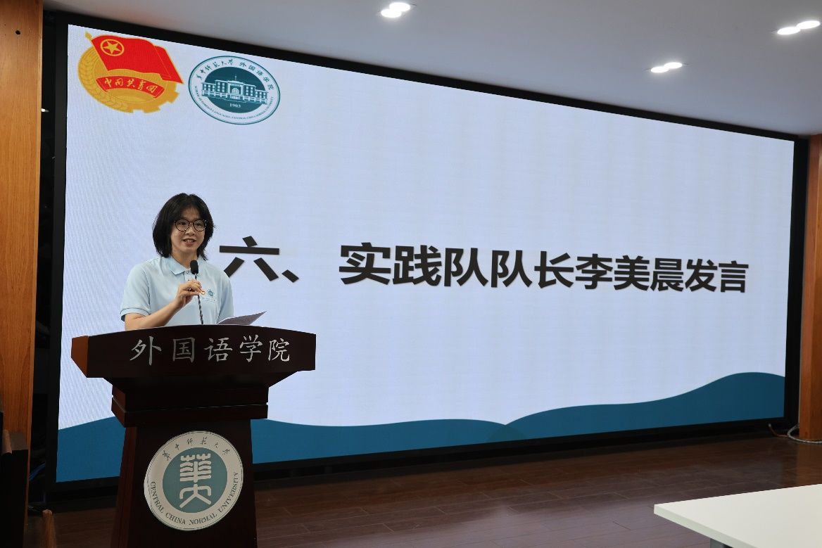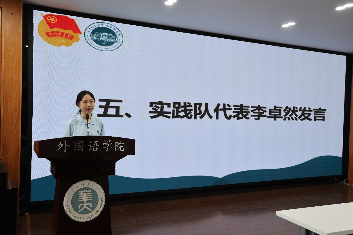 学院语思实践队队长李美晨的发言。她以章开沅先生对外院学子的寄语“做语言大师,思想旗手,行动先锋”为引,向全体队员提出五点期待:以“知”为基,以“语”为桥,以“合”为力,以“行”致远,以“安”为盾,共同在实践的广阔天地中淬炼成长。