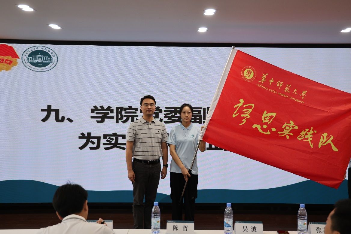 陈哲为实践队授旗,实践队学生代表上台接旗。