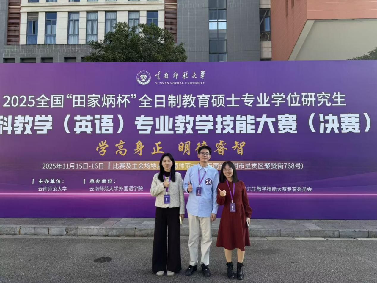 11月16日, 2025年全国“田家炳杯”全日制教育硕士专业学位研究生学科教学(英语)专业教学技能大赛决赛在云南师范大学圆满收官。我院参赛研究生不负众望,在全国顶尖学子的激烈比拼中脱颖而出,斩获多项荣誉——杨思宇同学勇夺二等奖,朱淋与黄琳萍同学同获三等奖,为学院赢得了荣誉。