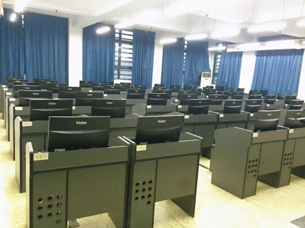 数字化同声传译实验室有译员6个,发言座16个,主席机1个,红外线接收机20个,硬盘录像机1台。主要承担交替传译、口译实践、同声传译、商务口译、科技口译、视译等实验课程。该实验室可提供六种不同语言的口语翻译训练,支持接力传译,同时传送的不同语言声音上的分离,能对课堂进行实时录音,并可以生成MP3音频文件,供课后对训练结果进行对比和分析,是院外语专业学生口译课同传、交传的实训地。