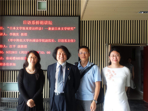 9月28日上午,李俄宪教授又受到南京大学外国语学院的邀请,在南京大学侨裕楼405报告厅进行了题为“日本文学原来要这样读!——兼谈日本文学研究”的 讲座。讲座由南京大学外国语学院副院长汪平副教授主持,南京大学日语系教师、研究生和本科高年级同学参加了讲座。