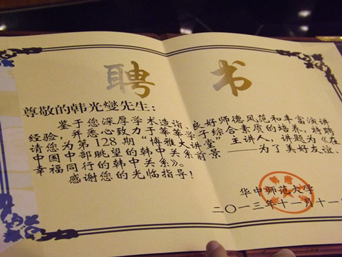 11月11日,大韩民国驻武汉领事馆总领事韩光燮先生在出席了我校第一届韩国文化节后,应副校长李向农教授之邀,作客第128期博雅大讲堂,为在场师生作了题为“在中国中部眺望的韩中关系前景 ——为了美好友谊、幸福同行的韩中关系”的专题讲座。