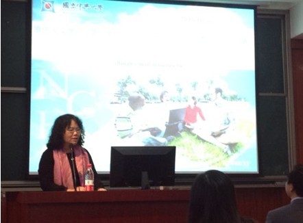 阮秀丽的报告主题为《原住民文学与生态思潮的交会:连续、关联与关系导向的自然观》。她通过两个理论介绍和一个作品例证在短短的十几分钟内带领在座师生了解了原住民文学和生态思潮,并分析探讨了两者的关联以及最终的自然导向。她指出,生态思潮是对人和自然环境的反思,其核心论述之一在于反省、检视人类中心主义,修补人与自然的关系。原住民传统和自然关系密切,原住民创作也多展现这个传统,同时和社会、经济、生态模式、信仰密不可分。阮秀丽教授提出了“延续性的文明”和“关联性的思维”,其对立面为“破裂性文明”(又称“突破性文明”),即自然和文化断裂:人类创造自己的世界,并把自己孤立于其他物种之外。进而阮教授探讨了“万物有灵论”,通过分析提出不是“我思故我在”,而是“我关系故我在”,或“我关系故我知”。最后阮教授以小说《鲸族人》为例,总结了作品表现出的“有灵世界”中自然和文化的连续、人和动物的连续。