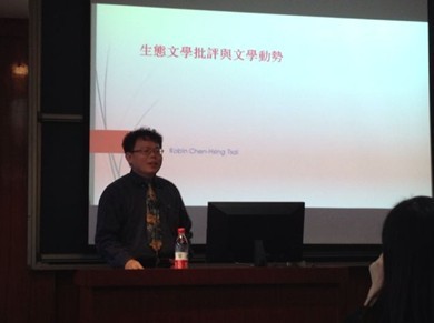 风趣幽默的蔡振兴教授为在座师生阐述《生态文学批评及其动势》。他从生态学、生态文学与文化批评讲起,指出通过不同的视角观察事物所产生的矛盾性。继而,他以短诗《羔羊》(The Lamb)为例,指出做文学要从经验到理论,提出文学就是生活,要懂得如何用新的方式观看它。在分析了史蒂文斯(Wallace Stevens)的诗歌《雪人》(Snow Man)之后,他提出了“客体言说”(the object speaks)的观点。在具体阐释他本人对于生态文学研究的理解时,他在分析自然(nature)和全球地域化(glocalization: the global and the local)等术语的基础上,强调了研究环境和地域的重要性,并指出了生态文学的若干发展趋势。