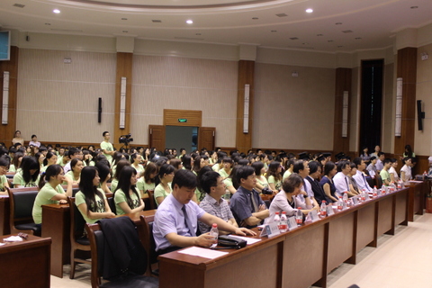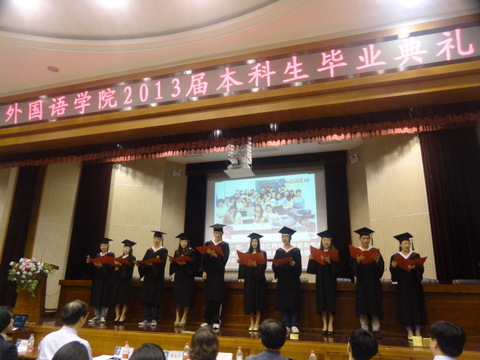 随后,毕业生代表韩语系2009级刘欣畅总结了大学四年的点滴以及学习成长经历,并代表全体毕业生对外院所有老师表达了深深的感激和谢意。低年级学生代表英语系2012级钱俊桦为学长学姐送上了幽默生动的祝福。学生家长代表英语系2009级学生冯硕的父亲冯艺给毕业生提出了不忘母校、不忘师恩、不忘奋斗的三点期望。