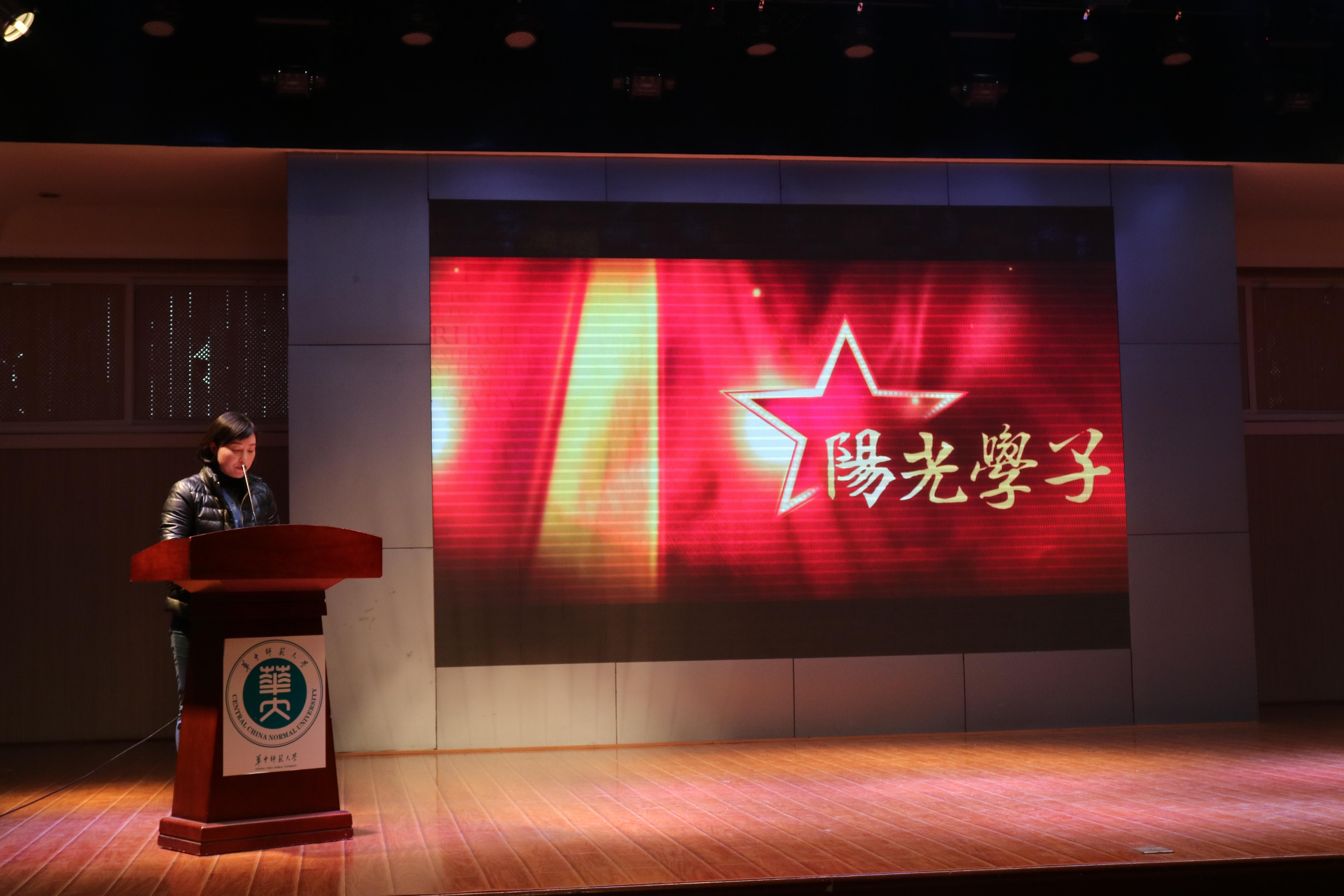 随后,院党委书记李云为5位提名奖获得者颁奖并合影留念。接着,观众们欣赏了“阳光学子”事迹展演。展演节目精彩纷呈,既有歌舞剧,又有小品话剧。《我们在俄罗斯由2013级俄语系的俄罗斯坦波夫留学交流团队出演。在2015年,俄语系的十姐妹远赴俄罗斯交流学习。异国他乡,她们相互依靠,共同奋进,全部以优异的成绩完成了学业。同时外,她们热心传播中国文化,在中俄文化交流方面所做出了自己的努力与贡献。