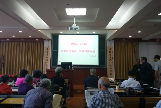 会上,老校友们一起观看了自制的小视频,发黄的老照片上年轻的容颜与现在的白发形成对比,时光的流逝一目了然。昔日的同窗们50年后重聚,忆同窗往事,话当年友谊,谈近年情景,欣喜之情洋溢会场。