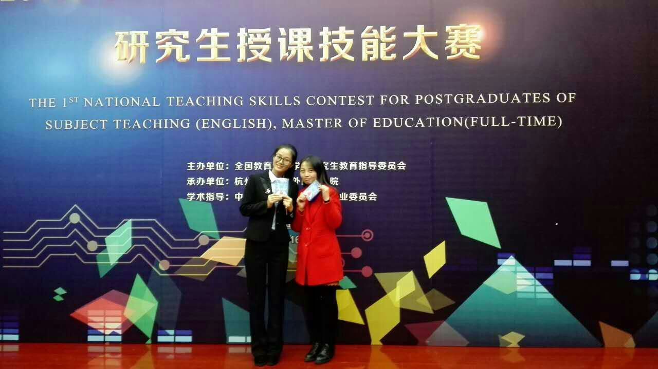 此次教育硕士学科教学(英语)授课大赛由全国教育专业学位研究生指导委员会主办、杭州师范大学外国语学院承办、中国教育学会外语教学专业委员会提供学术指导的第一届全国全日制教育硕士学科教学(英语)专业教学技能大赛。 本次大赛分为初赛和决赛。初赛阶段,67所参赛院校共选派了233篇学科教学(英语)专业研究生的教学设计,分为小学组、初中组和高中组进行评审,根据初赛专家评审委员会的评审结果,最终有来自全国30所院校的60名选手参加决赛。我校参赛选手2015级学科教学(英语)专业的学生孙薇薇、王晓敏分别进入初中组和高中组的决赛。 决赛采用抽签排序、抽签选题、评委和选手“双匿名”的形式,通过模拟授课和现场答辩两个环节进行。参赛选手说道:第一次经历这样正规严谨的比赛,是一宝贵的学习经历。 两位学生说道:回首整个比赛过程,她们特别感谢指导老师—向宗平老师。向老师在初赛时帮助她们多次修改教学设计;决赛期间鼓励他们积极准备决赛,并耐心地为她们的教学活动和设计进行答疑指导。同时也感谢外国语学院的所有老师对她们硕士期间的培养。她们会以本次比赛为契机,在将来的教师岗位中继续学习,不断提高自己的专业技能。