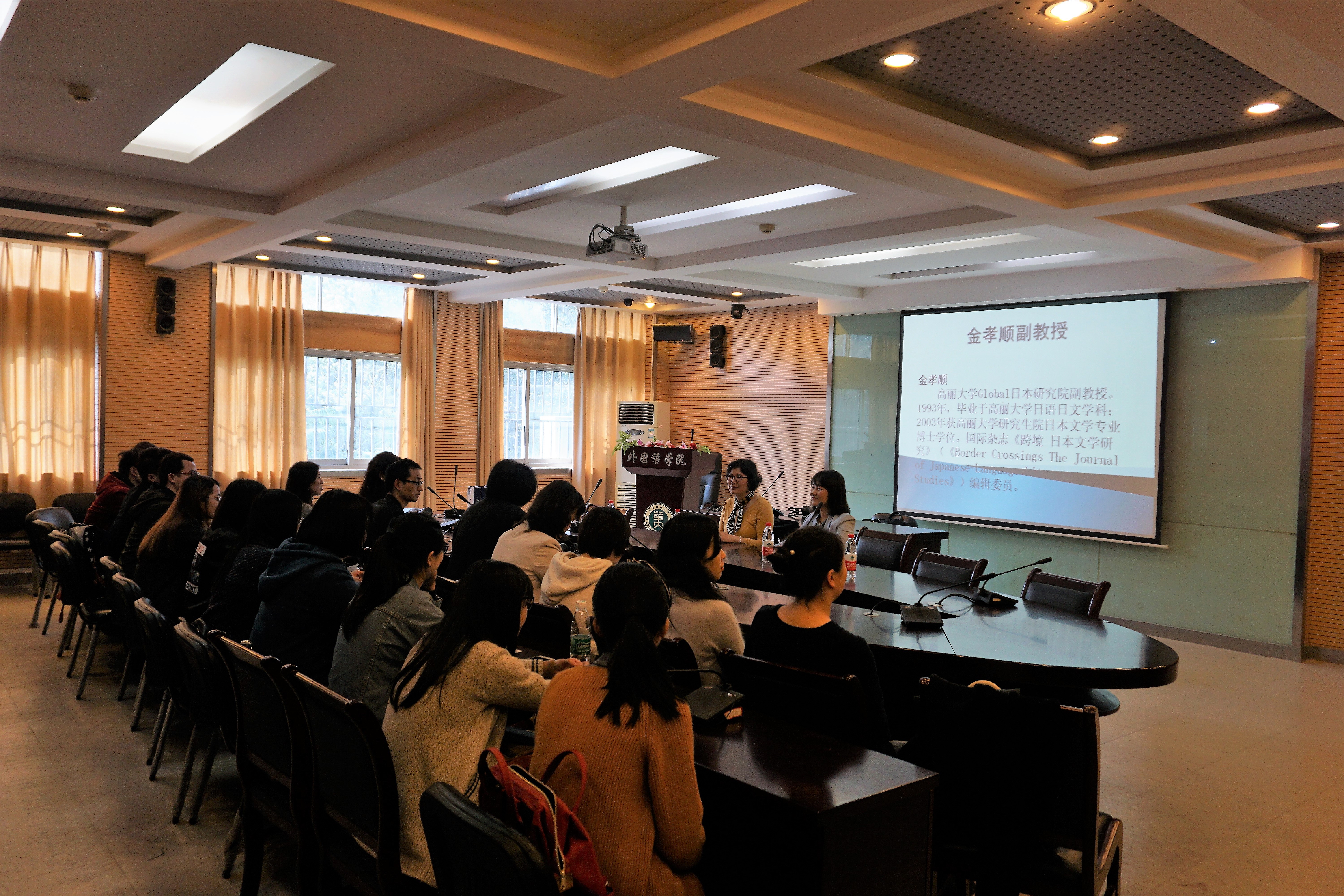 金副教授和严副教授首先提到了近代日本殖民时期的韩国日文文学,接着向我校老师介绍了韩国的日语教学研究同我国相似的曲折中发展的现状。随后两位副教授又从韩国民间自发的《人文科学学危机宣言》谈起,同我校教师共同探讨了中韩两国都面临的保护和发展传统文化的问题。我校尹仙花、占才成等教师对两位副教授先后进行了提问,讨论环节气氛热烈,在场老师对两国日语研究的曲折发展都深有同感。交流会最后的学生提问环节中,3位研究生关于两位副教授参与编辑的杂志、在日中国作家以及韩国流行文化的提问也颇有新意。