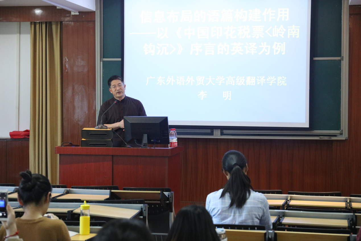 2017年4月27日下午,应外国语学院邀请,广东外语外贸大学高级翻译学院副院长李明教授在3408报告厅作了一场题为“信息布局中的语篇构建作用—以《中国印花税票<岭南钩沉>》序言的英译为例”的学术讲座。李明教授的演讲主要包括三个部分。在第一部分,李教授详细介绍了信息布局理论中的前景信息和背景信息这两个概念,并对这两种信息的作用分别作了解释。在第二部分,李教授主要讲述了前景信息和背景信息的呈现方式。通过对比英汉两种语言中两种信息的不同呈现方式,提出要使译文符合译入语的语篇信息构建模式,并指出关键是要分清两种信息的主次,进行合理布局。在第三部分,李教授以自己翻译的《中国印花税票<岭南钩沉>》序言为例,详细介绍了对主要信息和次要信息的不同处理方法。