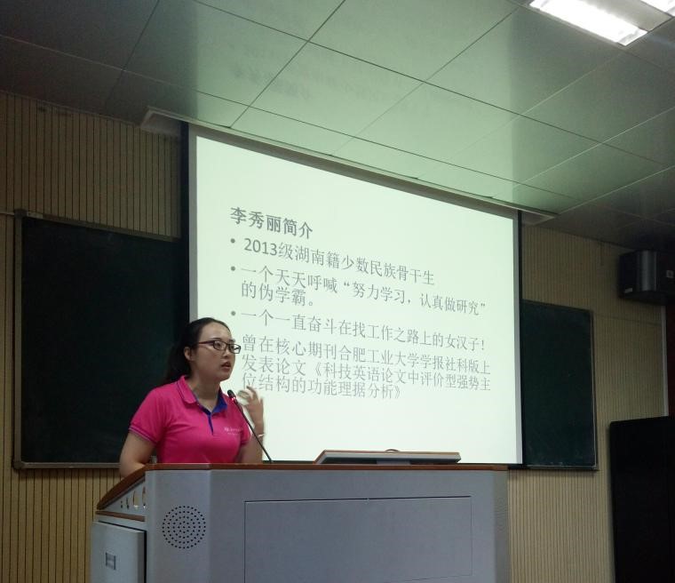 李秀丽简介 2013级湖南籍少数民族骨干生 在核心期《合肥工业大学学报》(社科版)上发表论文《科技英语论文中评价型强势主位结构的功能理据分析》 李秀丽深知“理论联系生活”的道理。她坦言道,自己在合肥工业大学学报上的这篇文章起源于学生对她的一个提问。李秀丽告诉15、16级的同学:一个小小的问题到一篇论文,其中收集整理语料的繁琐、写作的困难等等,这些都是写论文、毕业论文时一定会碰到的问题,大家要坚定信心,有问题多和老师同学沟通请教。随后,她也告诉大家在找工作时一定要有清晰的职业规划加上充分的准备。