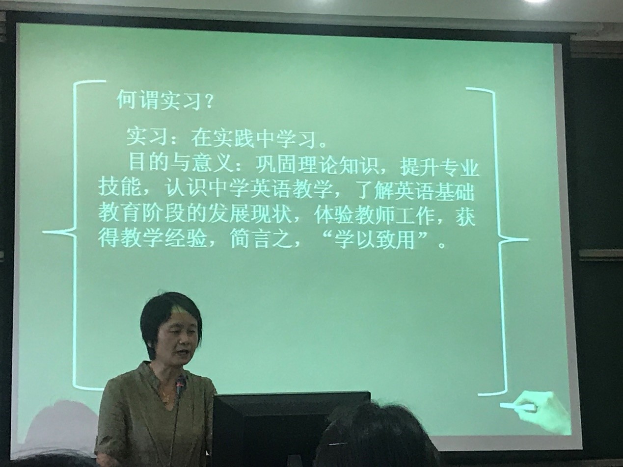 副院长高晓芳教授向同学们传达了实习的本质精神,强调实习的根本目的与意义在于巩固理论知识,提升专业技能,认识中学英语教学,了解英语基础,从而体验教师工作,获得教学经验。英语系主任方幸福教授则从实习时间与方式、实习任务与内容、实习纪律与安全等方面对实习工作进行了简单的安排和布置。同时从实习生、实习小组、带队教师三个层面提出要求:一是要求实习生不忘初心,励志为师;二是要求实习小组团结一致,齐心协力解决实习过程中出现的各种问题,加强沟通与交流,互帮互助;三是要求带队教师不负重托,做好导师,协助解决学生的切身问题。