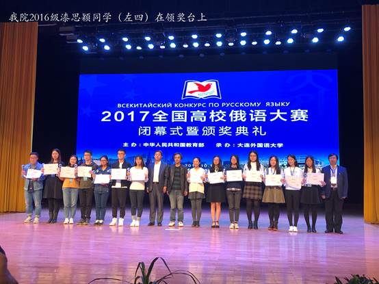 2017年10月16日,由教育部主办的《2017全国高校俄语大赛》在大连外国语大学落下帷幕。北京大学、北京外国语大学、上海外国语大学等151所高校派出选手参赛。我校外国语学院俄语系16级漆思颖同学以初赛第三的优异成绩进入复赛,经过演讲、口语表述等项目角逐,最终获得大赛三等奖的好成绩;将由国家留学基金委全额资助,于来年赴俄罗斯高校进修一年。