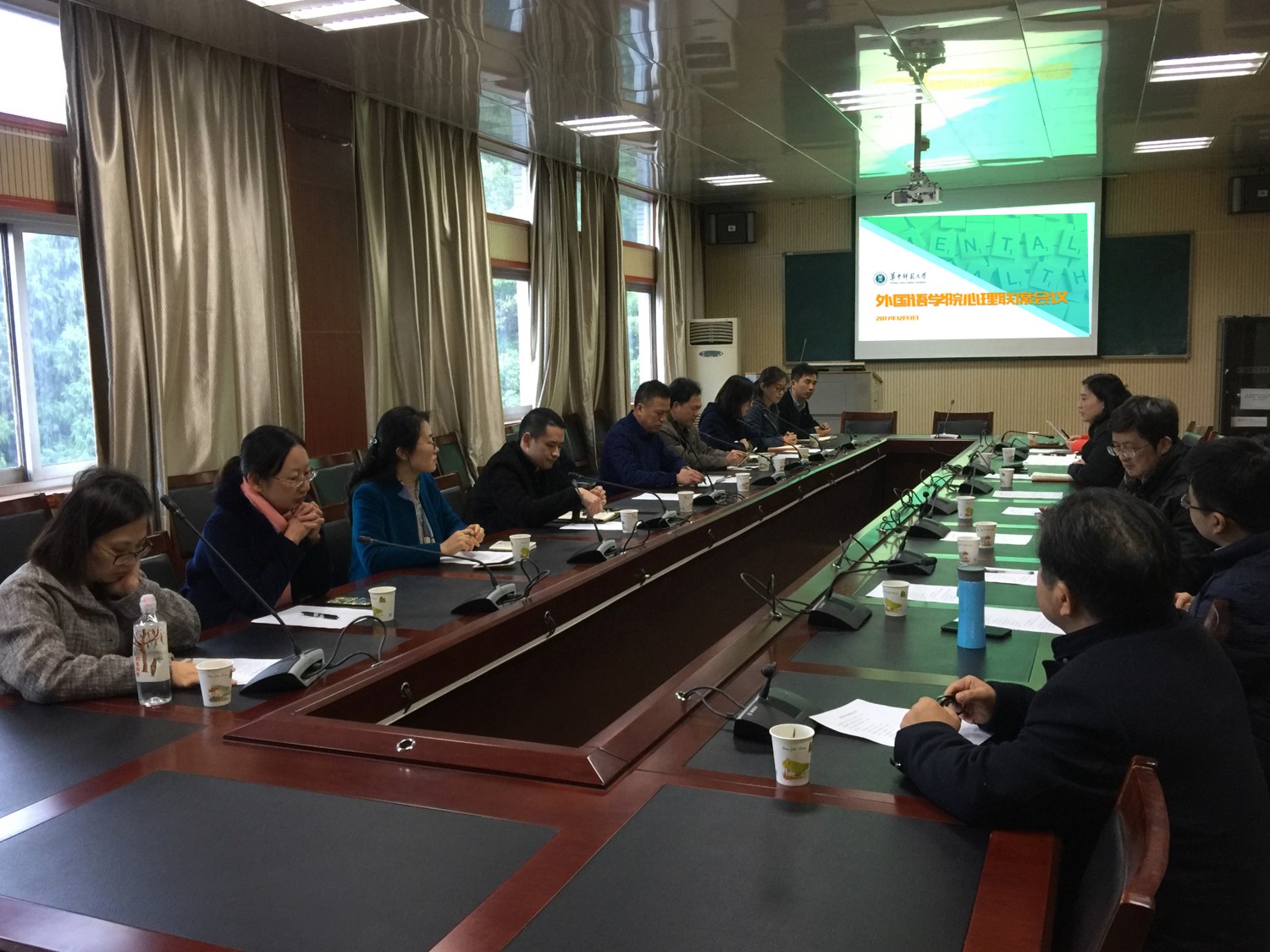 为深入贯彻落实全国高校思想政治工作会议精神,进一步加强大学生心理健康教育工作,12月7日下午外国语学院召开了2017年度心理健康教育工作联席会议。学工部副部长王东爽、心理咨询中心副主任吴才智、研究生工作部刘卫老师、外国语学院党委副书记张静、外国语学院班主任代表及全体辅导员参加了本次会议。会议由张静书记主持。
