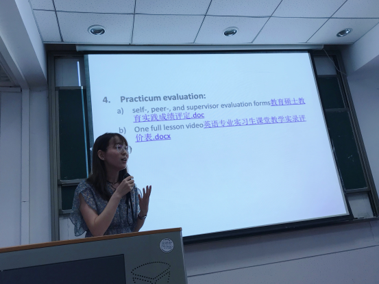闫春梅教授以“Swim in the water”为题,强调对2017级教育硕士的实习要求,要求做好从学生身份到教师身份的转变,提出我们不仅要做好教学,也要做好学生管理、班主任工作、反思与研究等。同时,闫春梅教授着重强调“态度”问题,认为要“concentrate on practicum”。