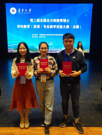 2018年9月21日—23日,第二届全国全日制教育硕士学科教学(英语)专业教学技能大赛(决赛)在鲁东大学成功举办。外国语学院文斌老师带领我院三名决赛选手赴山东烟台参赛,三位选手表现出色,取得了骄人的成绩。其中,侯忠义、彭露娇两位同学荣获一等奖,纪力源同学荣获二等奖,向宗平老师被评为优秀指导教师。