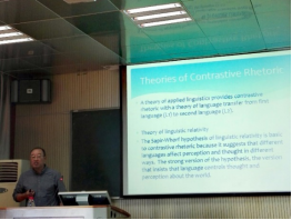 接着,华中师范大学外国语学院的刘东虹教授为大家带来题为“Comparative Rhetoric Approach to Chinese Paragraphs”的讲座。刘老师旨在用实证方式探寻不同文化背景下的写作修辞差别。通过对比中美两国中学生教材中的课文,考据中国教材里汉语说明文的段落修辞方式与美国教材的说明文是否相似。从而强调写作教学和研究中英语修辞教学的必要性。