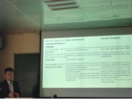 华中师范大学的王佳宇博士从社会语言学的视角对语言研究表达了新的看法。王老师认为在多模态建构的环境中,语言是众多资源中的一种。此外还包括视觉,听觉和空间等非语言资源。王老师举例说明了语言与其他资源之间如何协同作用,如语言与地标的关系、语言与物体形状的关系,语言与气味的关系等。