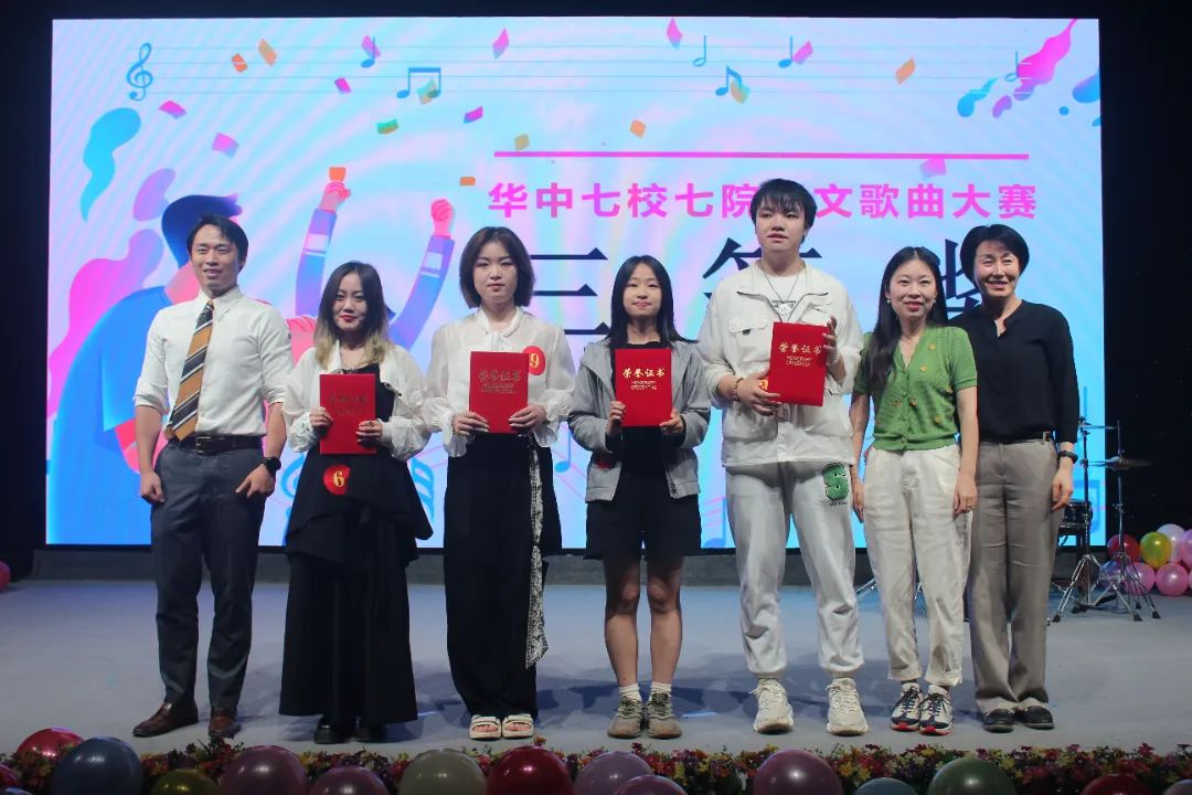来自中国地质大学的慢漫乐队,华中师范大学的尹钰洁、贾守婷,中南财经政法大学的陈晨获得三等奖;来自华中科技大学的王珊,华中师范大学的张窈仪,华中农业大学的余秋瑶,武汉理工大学的徐诗涵,华中科技大学的贾顺天获得优秀奖。嘉宾和评委老师们依次为选手颁奖并合影留念。
