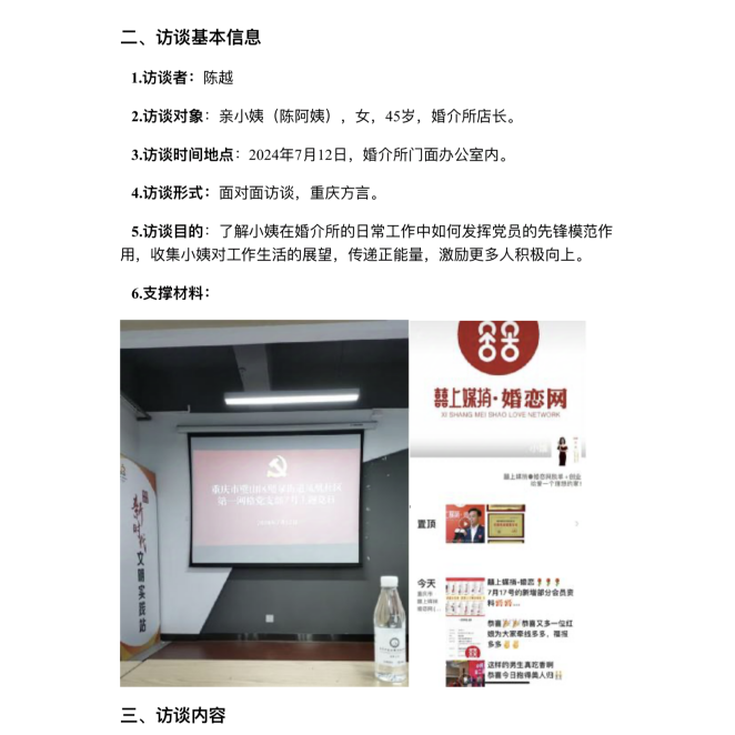 陈越的访谈同样触动人心。她的小姨,在看似平凡的婚介所岗位上,却以不凡的情怀和行动诠释着党员的先锋模范作用。小姨常说:“每一对幸福婚姻的促成,都是对社会和谐的小小贡献。作为党员,我更应该以身作则,用真诚和专业为单身男女搭建起爱的桥梁。”通过访谈,陈越不仅看到了小姨工作中的辛勤付出,更感受到了那份对党忠诚、对人民热爱的深沉情感。