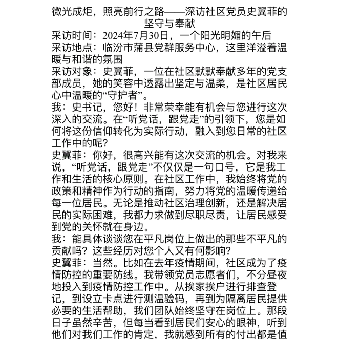 第三板块——听党话,跟党走之红影访谈。“为共产主义事业奋斗终身”是每一位共产党员入党时的誓言,也是每一位党员的信仰和使命。黄继光、邱少云、董存瑞……这些耳熟能详的英雄名字时刻铭记在我们心中,成为我们不断前行的力量,这是遥远的召唤,其实在我的身边也不乏优秀的榜样,他们在平凡中作出不平凡的贡献,这是近处的指引。青苗班学员利用暑期对在平凡岗位上闪闪发光的共产党员进行采访。学员史博文采访了临汾市蒲县党群服务中心的社区党员史翼菲,深入探究了她如何将“听党话,跟党走”这份信仰转化成实际行动,融入日常社区工作中。学员陈越的访谈则全面了解了她的小姨在婚介所的日常工作中如何发挥党员的先锋模范作用。在史博文的采访中,史翼菲同志深情地分享了她的工作日常:“作为一名社区党员,我深知‘听党话,跟党走’不仅仅是一句口号,而是要落实到每一次为居民排忧解难的实际行动中。从组织社区活动,促进邻里和谐,到疫情期间坚守岗位,确保防疫措施落实到位,我始终将党的宗旨铭记于心,努力让党的温暖传递到社区的每一个角落。”史翼菲的讲述,让史博文深刻感受到了共产党员的责任与担当,也激励着他要在自己的学习和生活中,积极践行党的教诲,不忘初心,砥砺前行。