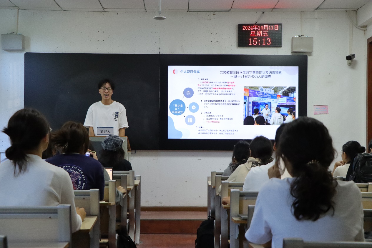 分享参赛经验时,姬高阳以“如何开展科创项目”为题,以项目推进时间线为轴,以自己团队项目赛题为例,从前期探讨项目背景,到中期采集分析数据,再到后期成果展示,向同学们展示了科创项目开展的全过程,为外院创新创业团队提供信息数字化启发,鼓励外院学子紧跟时代,加强个人信息素养。