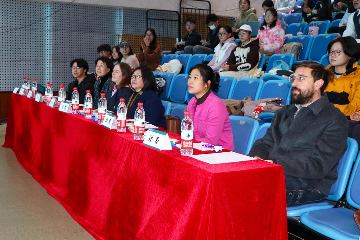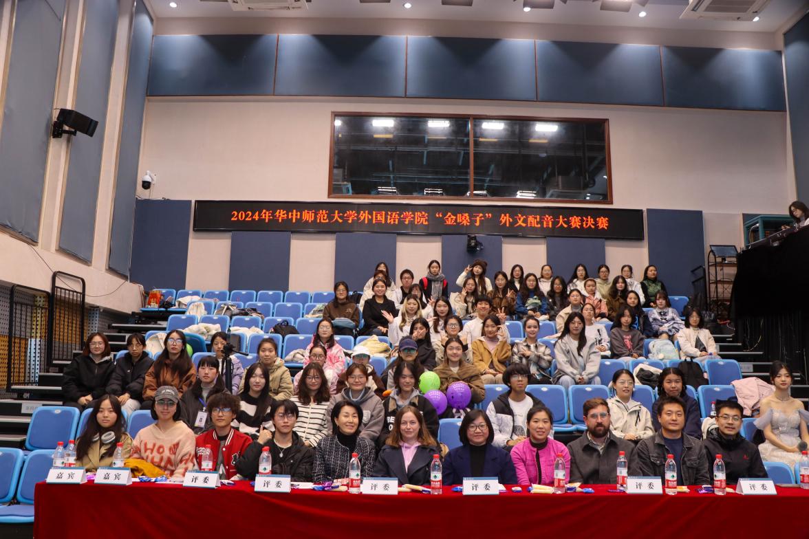 为了激发学生的语言学习兴趣,营造良好的语言学习氛围,11月30日下午,“金嗓子”外文配音比赛决赛于九号楼演播厅成功举办。本次比赛由共青团华中师范大学外国语学院委员会主办,英语系2023级团总支和学生会承办,小语种2023级团总支和学生会协办。外国语学院英语系教师陈志红、外教John Miller、 Lisa,韩语系教师徐祯爱,俄语系教师Polina,学生张煌担任比赛评委,学院团委书记吴波、23级英语系辅导员张志彬作为嘉宾出席。